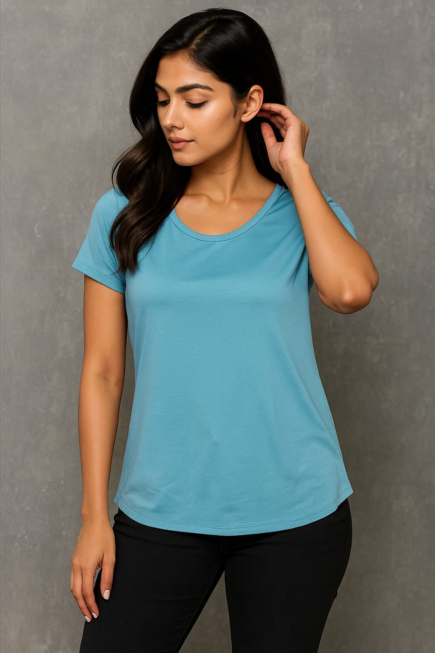 Women’s T-shirt shown in the image is made of challis woven fabric